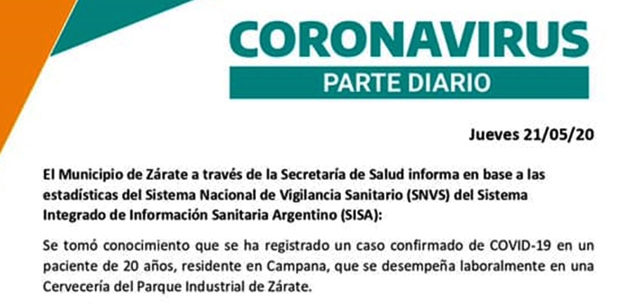 “El Municipio de Zárate a través de la Secretaría de Salud informa en base a las estadísticas del Sistema Nacional de Vigilancia Sanitario (SNVS) del Sistema Integrado de Información Sanitaria Argentino (SISA), que se tomó conocimiento que se ha registrado un caso confirmado de COVID-19 en un paciente de 20 años, residente en Campana, que se desempeña laboralmente en una Cervecería del Parque Industrial de Zárate”, fue confirmado por las Autoridades del vecino Distrito.