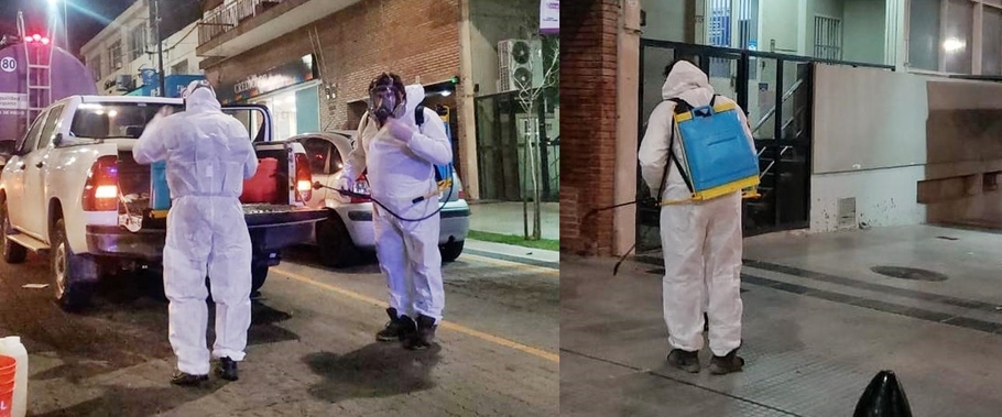 Anoche, personal municipal se hizo presente en el edificio y llevó a cabo tareas de desinfección, acompañado por un camión cisterna que hizo lo propio en veredas y la principal arteria comercial de la Ciudad.