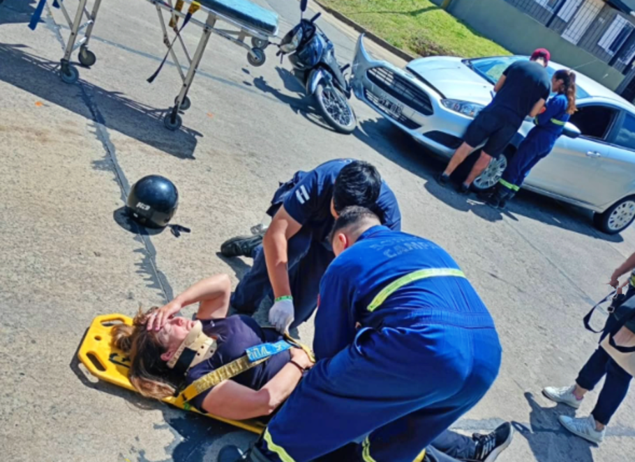 Una mujer que circulaba en moto resultó herida este sábado por la tarde al colisionar con un Ford Fiesta en la intersección de Jacob y Pueyrredón. La víctima, que llevaba casco, fue trasladada al hospital con dolencias varias. Bomberos Voluntarios y personal de emergencia trabajaron en el lugar.