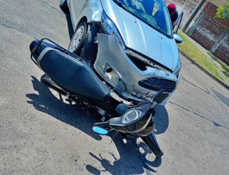 Un accidente de tránsito se registró en la tarde del sábado en la intersección de las calles Jacob y Pueyrredón, donde una motocicleta y un automóvil Ford Fiesta colisionaron de manera violenta.