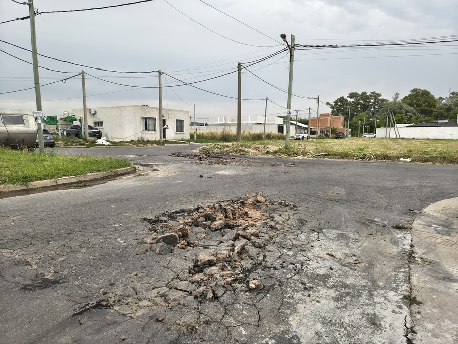 Al realizar maniobras para intentar salir del lugar, el peso del camión provocó la rotura del pavimento en las calles Los Cedros y Los Cerezos, generando daños visibles en la calzada y preocupación entre los vecinos, que observaron la escena con sorpresa e indignación.