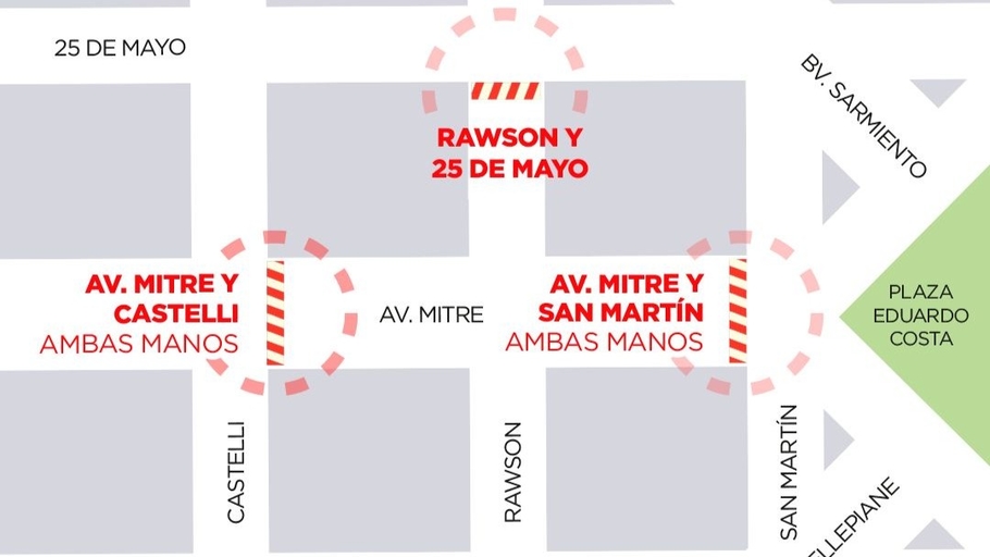 El operativo se pondrá en marcha a partir de las 21 horas del miércoles 24 de diciembre e implementará interrupciones al tránsito en las siguientes intersecciones: A. Mitre y Castelli, Rawson y 25 de Mayo y Av. Mitre y San Martín.