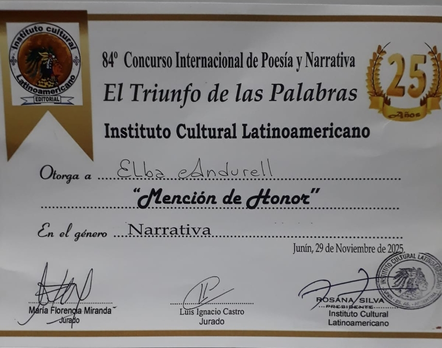En esta oportunidad destacamos la labor, constancia y trabajo literario de nuestras socias Elba y Hebe Andurell, que han participado en el 84º Concurso Literario Internacional de Poesía y Narrativa “El triunfo de las palabras” organizado por el Instituto Cultural Latinoamericano con sede en Junín, Pcia de Buenos Aires, Argentina, obteniendo ambas Mención de Honor, Elba en Narrativa con su trabajo “Un pueblo, un solo andén” y Hebe Andurell en Poesía con su poema “Tu guitarra”.