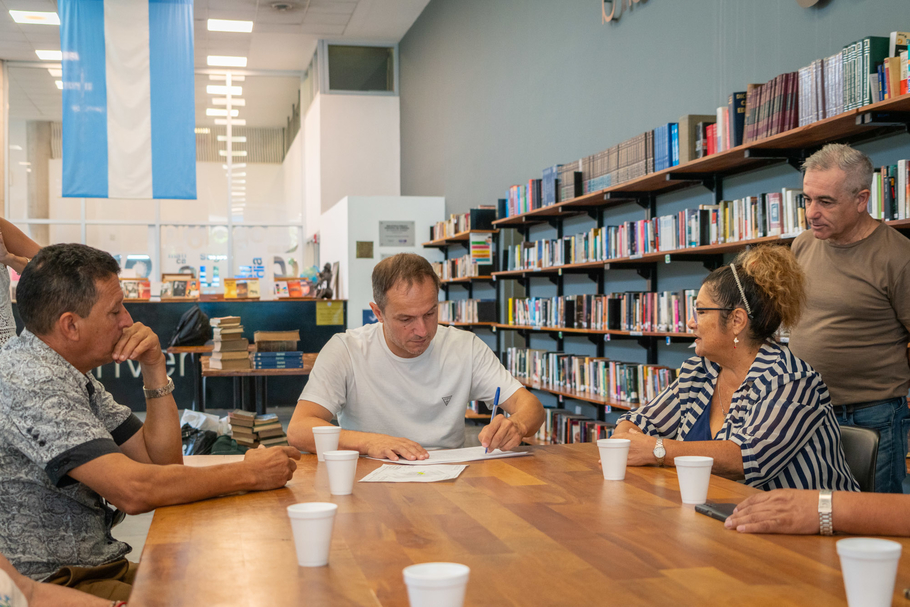 Durante la reunión, que se desarrolló en la Biblioteca Pública Municipal, el jefe comunal firmó el acta correspondiente y entregó en manos a su presidenta, Alina Gómez, formalizando así la posesión del espacio destinado a la institución.
