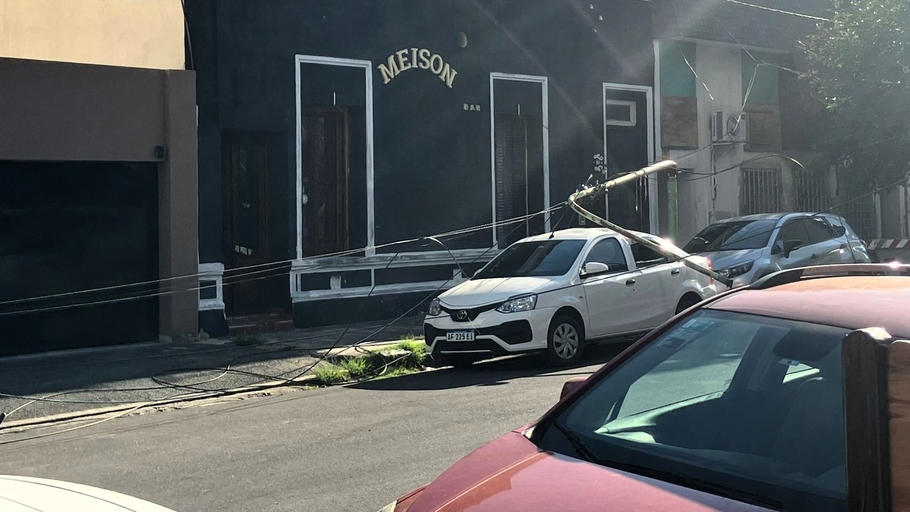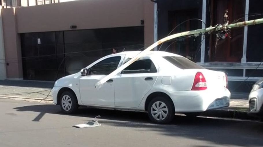 Un vehículo de gran porte superaba la altura permitida causando destrozos en la esquina de De Dominicis y Belgrano, en pleno centro, al enganchar cables aéreos, derribar postes y dañar varios autos estacionados. El tendido terminó sobre la calzada y dejó cables colgando a baja altura.