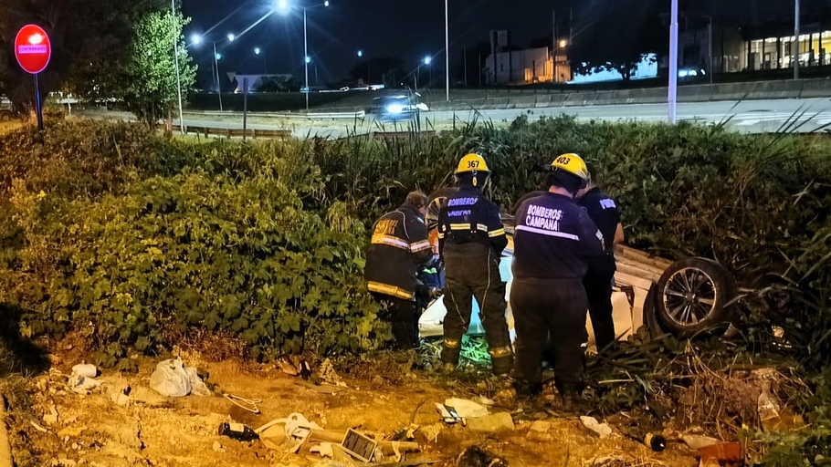 Un Peugeot 208 que circulaba por Panamericana volcó y cayó a una zanja en Colectora Norte y Rawson. En el auto viajaba una familia con dos adultos y dos menores: los mayores quedaron atrapados y debieron ser rescatados por Bomberos que cortaron la carrocería para liberarlos, mientras que los chicos sufrieron cortes y golpes. Los cuatro fueron asistidos por el SAME y trasladados al Hospital Municipal San José.