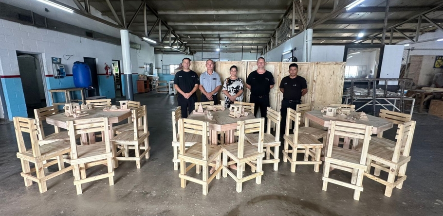 Personas privadas de libertad de una cárcel bonaerense de Campana elaboraron mesas hexagonales, sillas, armarios y juegos didácticos para una escuela primaria de la ciudad de Zárate en una iniciativa de servicio a la comunidad.
