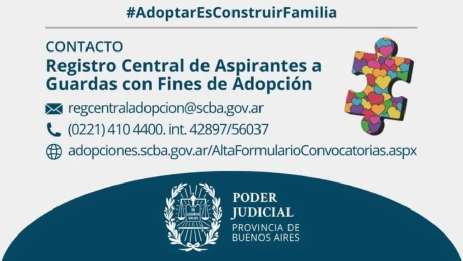 Las personas interesadas en obtener más información o postularse pueden comunicarse con el Registro Central de Aspirantes a Guardas con Fines de Adopción a través del correo electrónico: regcentraladopcion@scba.gov.ar o telefónicamente al (0221) 410-4400, internos 42897 y 56037.
