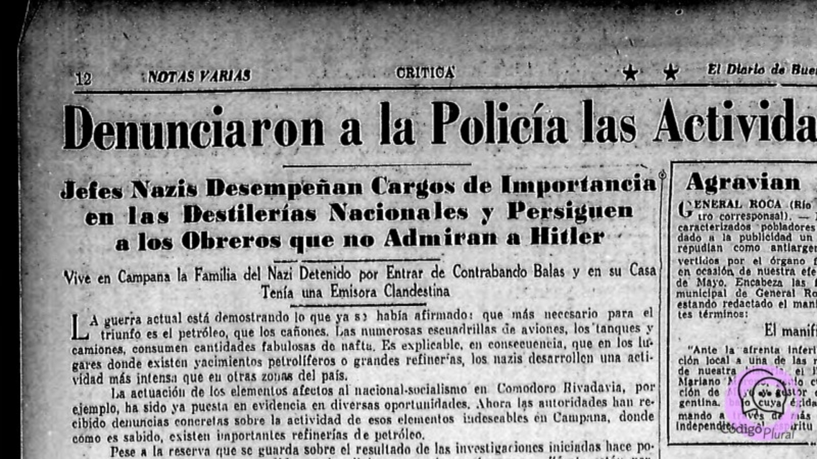 El medio de comunicación campanense Código Plural presentará su nuevo documental titulado “Tras las Huellas del Reich: Una investigación histórica sobre el nazismo en Campana”, una producción que pone el foco en un aspecto prácticamente desconocido del pasado local: la presencia activa de simpatizantes y agentes vinculados al régimen nazi en la ciudad durante la década del ‘30 y hasta el final de la Segunda Guerra Mundial.
