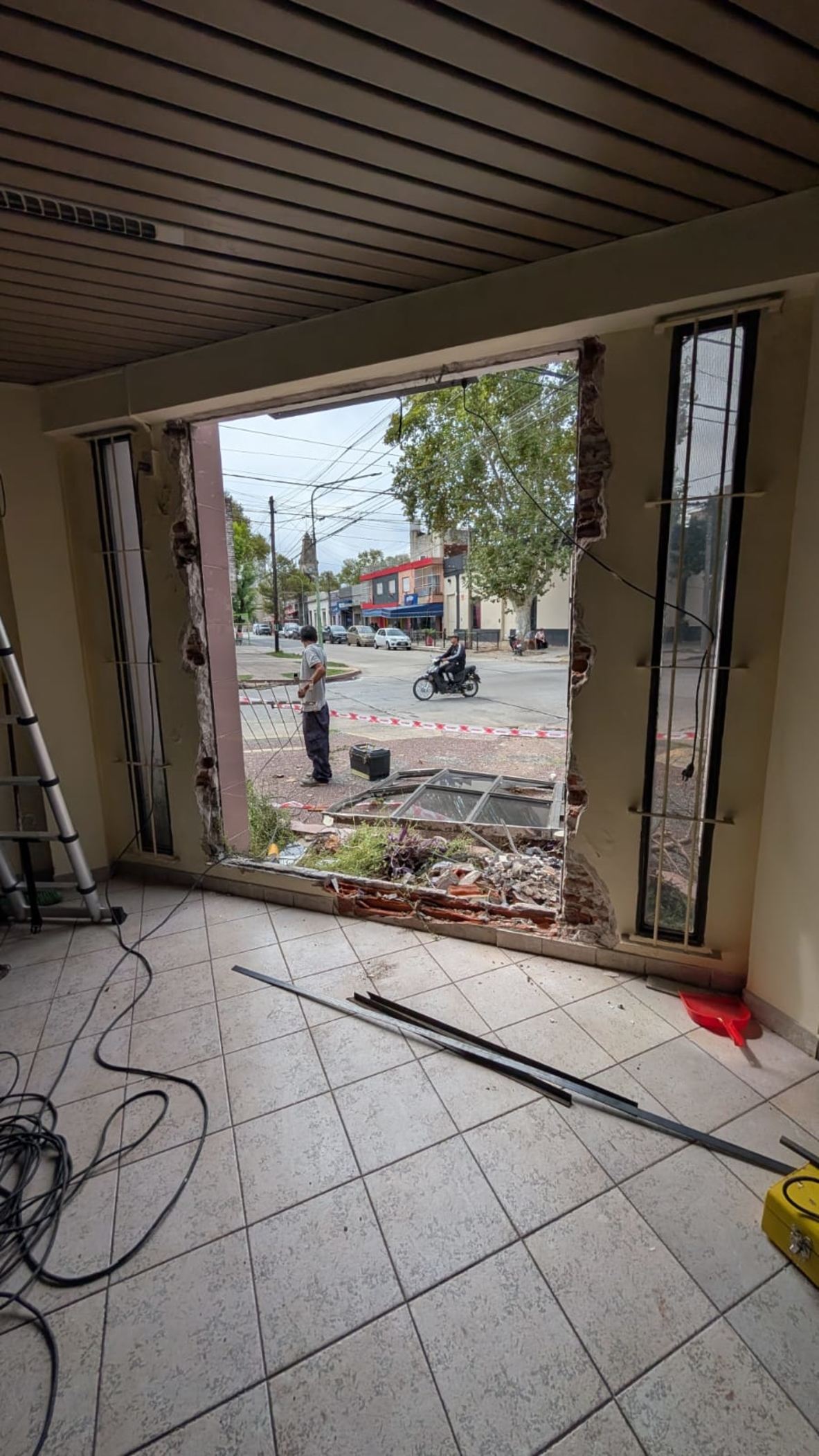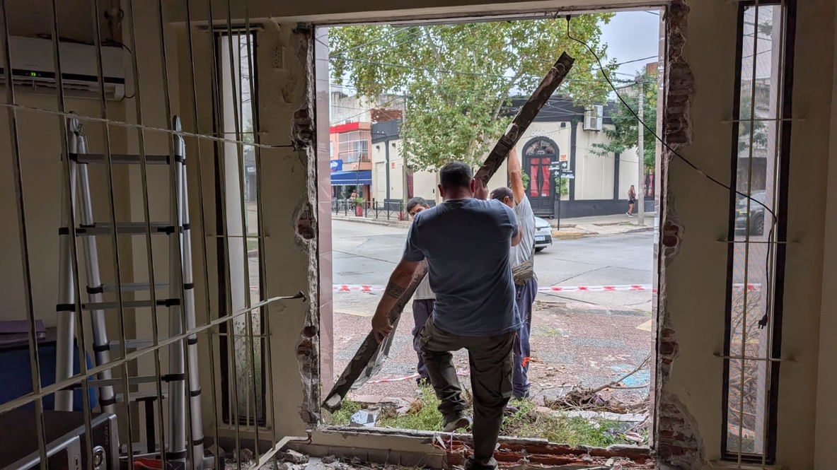 La trayectoria del Audi, sin embargo, continuó su curso descontrolado. El vehículo se subió a la vereda y terminó incrustándose directamente contra la ventana de la redacción de nuestro propio medio de comunicación, arrancando previamente el poste nomenclador de las calles, el cual quedó debajo de una de las ruedas. Parte de la trompa irrumpió en la oficina, derramando el agua del radiador por todo el piso. El fuerte impacto hizo volar dos de nuestros escritorios, provocando severas pérdidas materiales que incluyen el mobiliario y diversos equipos informáticos de trabajo. Resulta un detalle sumamente preocupante que, ante semejante colisión frontal, los airbags del automóvil nunca se activaron. El joven conductor resultó ileso, ya que el auto quedó encajado contra una reja ubicada justo entre dos columnas de la estructura, evitando que la cabina sufriera daños fatales.