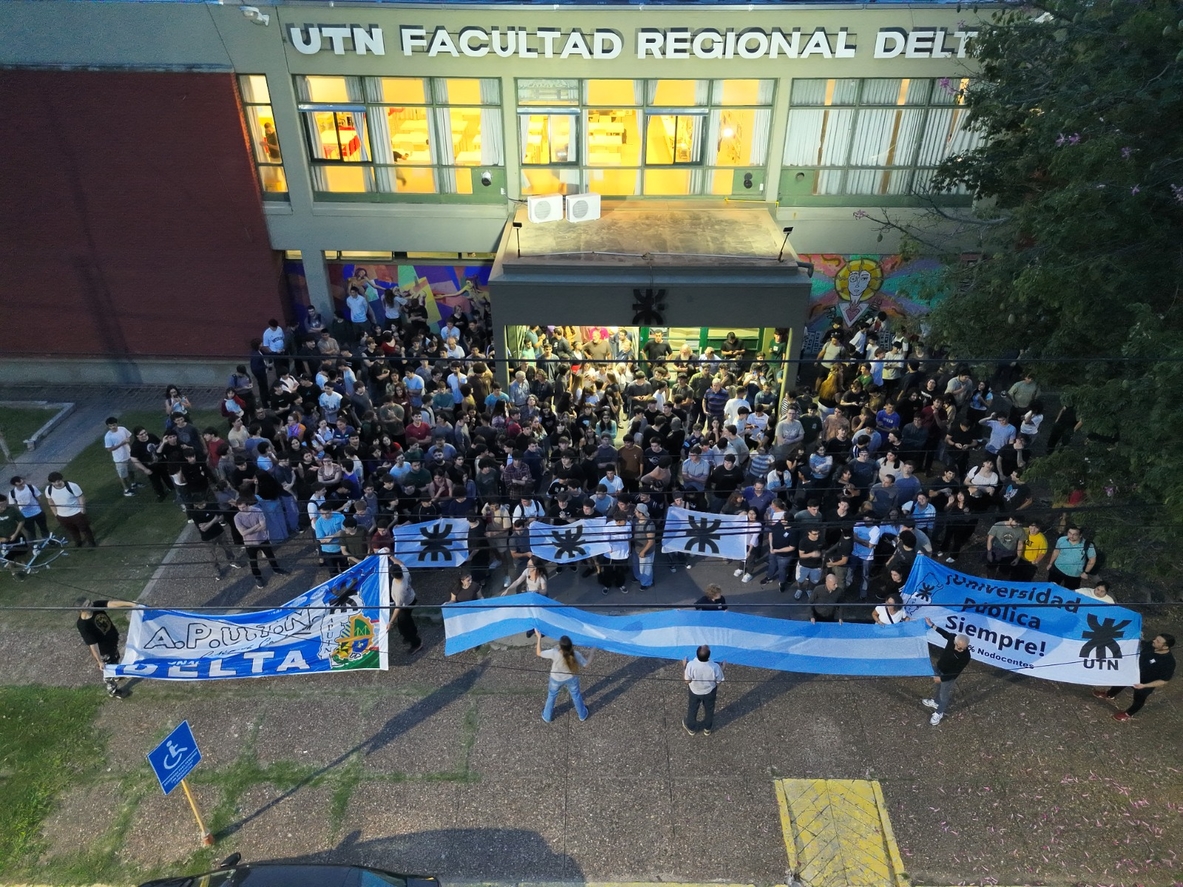 La Universidad Tecnológica Nacional, Facultad Regional Delta (UTN FRD), llevó adelante un banderazo y abrazo simbólico con el objetivo de visibilizar la grave situación que atraviesa el sistema universitario público y exigir el cumplimiento de la Ley de Financiamiento Universitario.