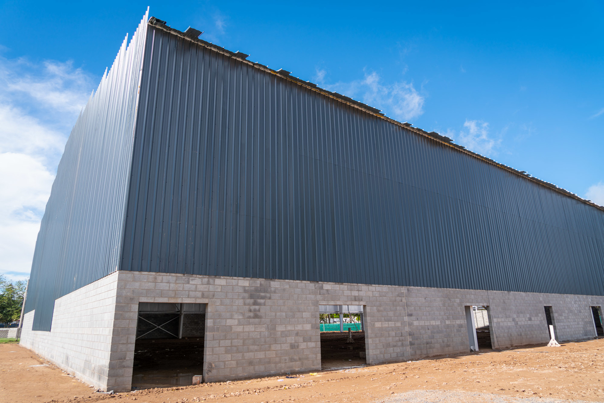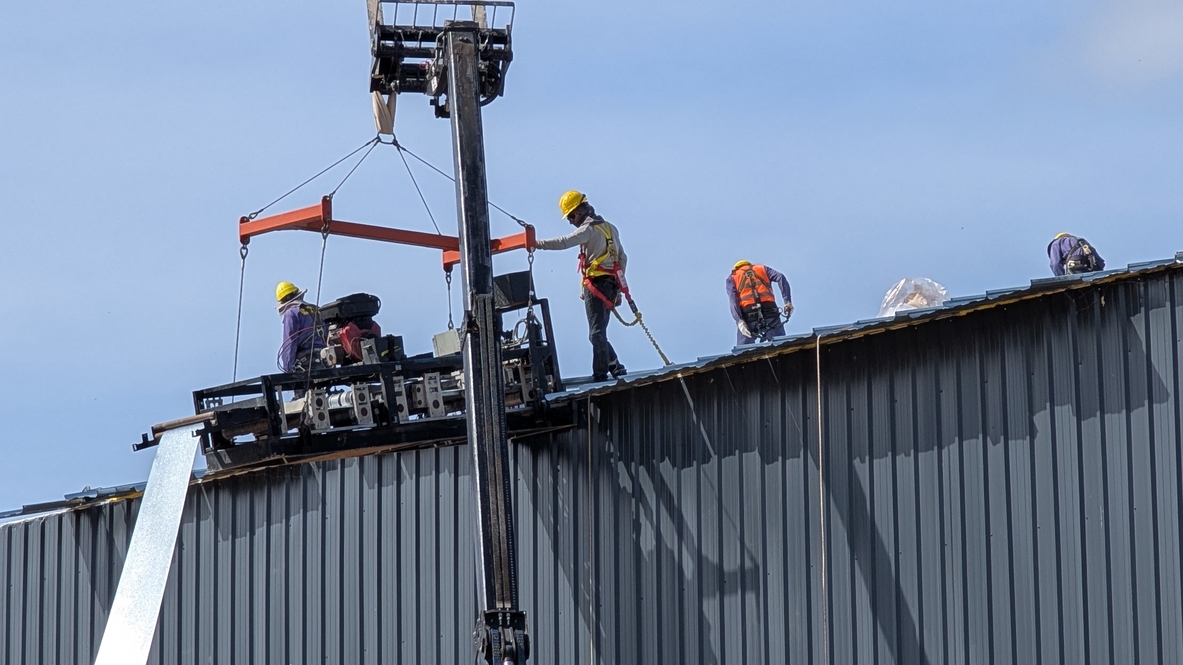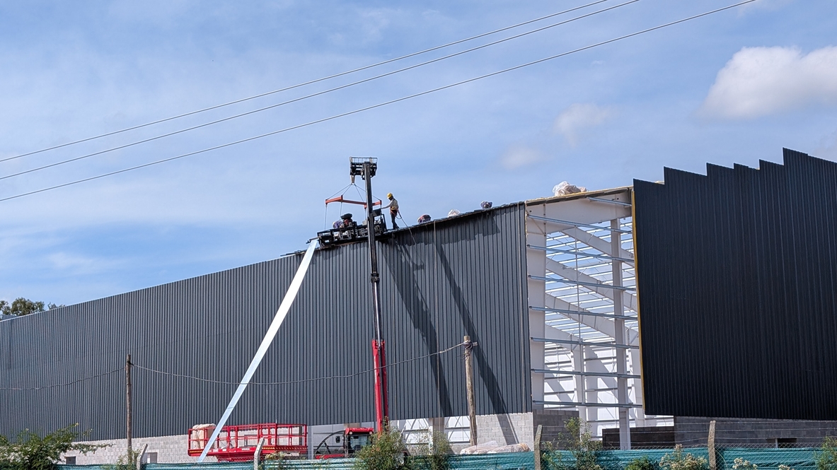 Actualmente se desarrollan tareas de techado que incluyen la colocación de chapas sobre la estructura metálica principal, junto con cerramientos parciales en mampostería de ladrillos de cemento y laterales en chapa galvanizada.