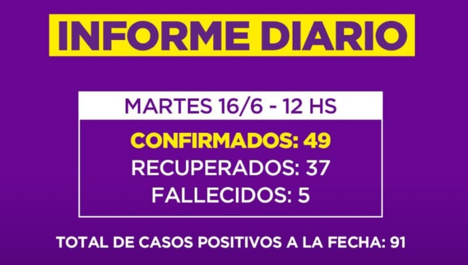 De esta manera, la ciudad totaliza 91 Casos Confirmados desde que comenzó la pandemia y hasta la fecha; de ellos, 49 permanecen en la actualidad como tales.