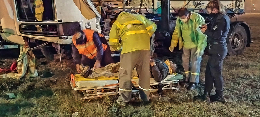 El vehículo circulaba por la rotonda de Las Acacias. Hizo un efecto tijera, impactó contra una columna de alumbrado y terminó arriba de la rotonda. El transportista sufrió lesiones y cortes en el rostro, y fue hospitalizado.