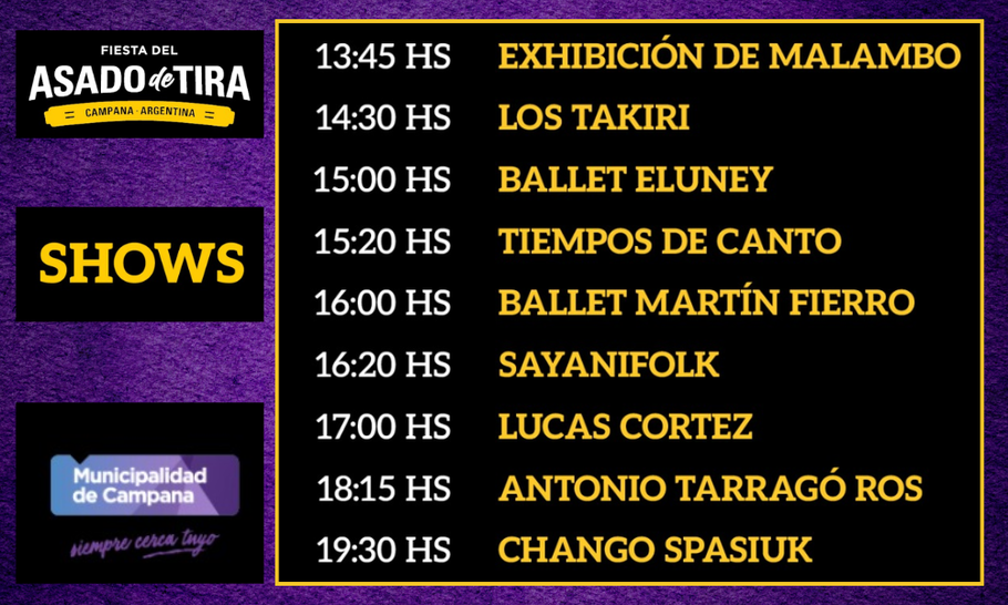 Y, además, se desarrollarán una gran cantidad de shows artísticos que tendrán la participación de “Los Takiris”; los ballets Eluney y Martín Fierro; “Tiempos de Canto”; Sayani Folk; y Lucas Cortez. También habrá una demostración de malambo.