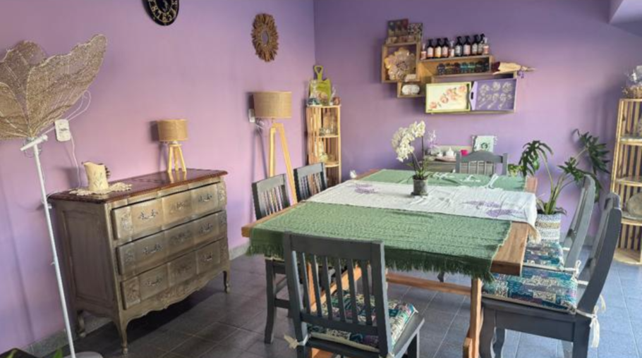 El local se complementa con una selección de productos de elaboración propia para la ambientación del hogar, como velas aromáticas y jabones artesanales. También se pueden encontrar sahumerios, aromatizantes y lavandas.