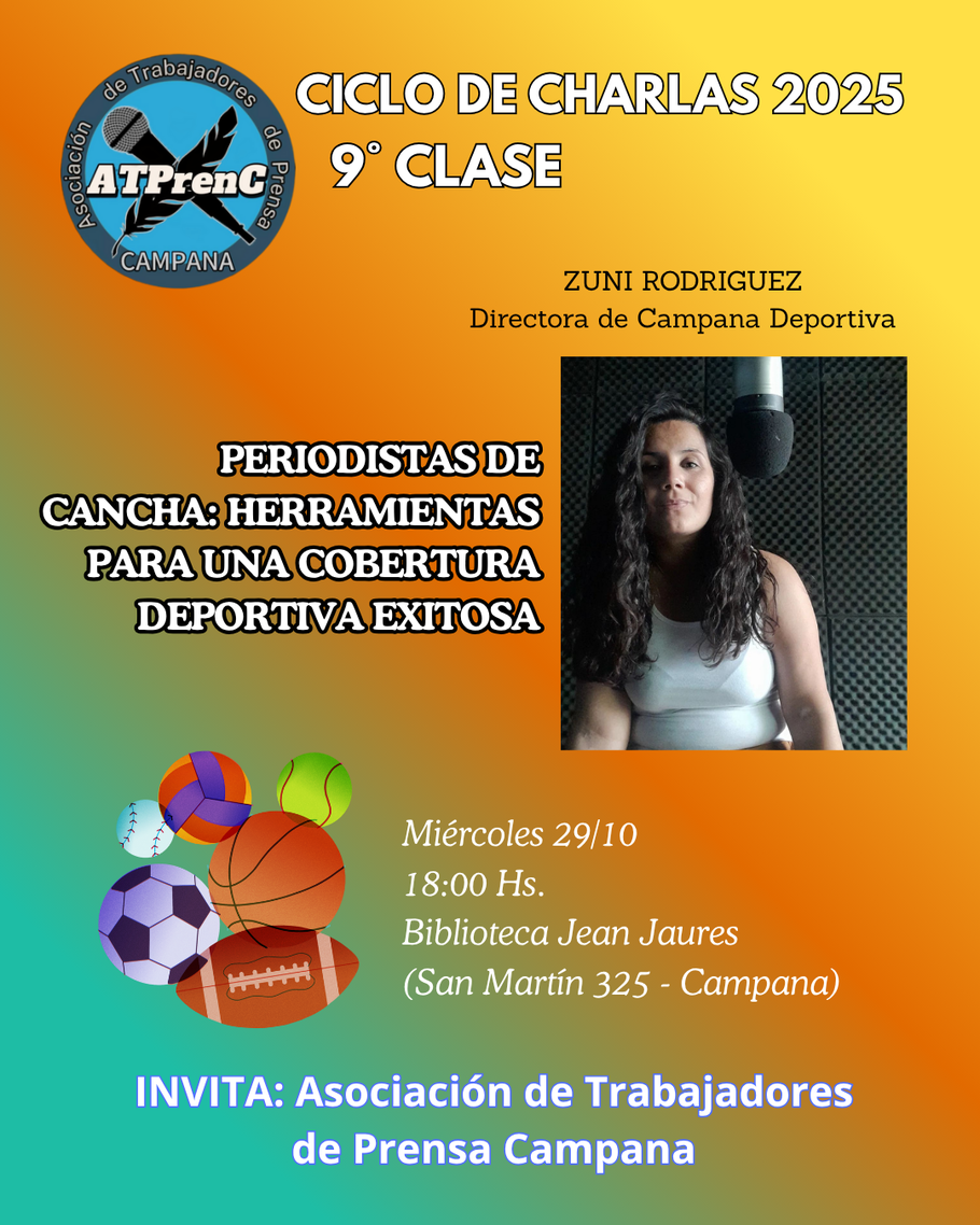 La próxima cita será el miércoles 29 de octubre, con la periodista deportiva y directora de Campana Deportiva, Zuni Rodríguez, quien estará a cargo de la novena charla del ciclo. Libre y gratuito a partir de las 18 hs en la Biblioteca Jean Jaurès (San Martín 325). Incripciones al link: