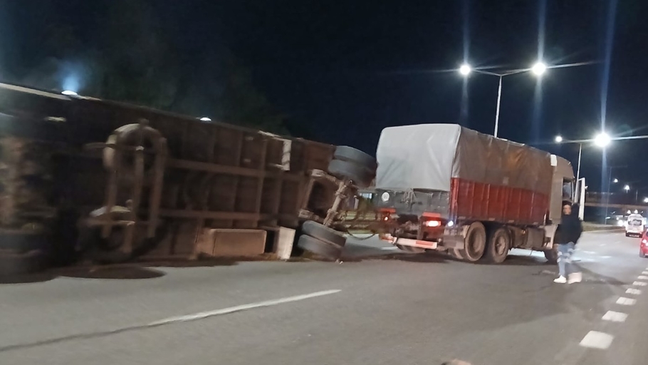 El acoplado quedó tendido sobre la calzada volcando toda su carga, mientras que la cabina del camión permaneció en pie. El automóvil involucrado terminó en contramano, mirando hacia mano a Capital.