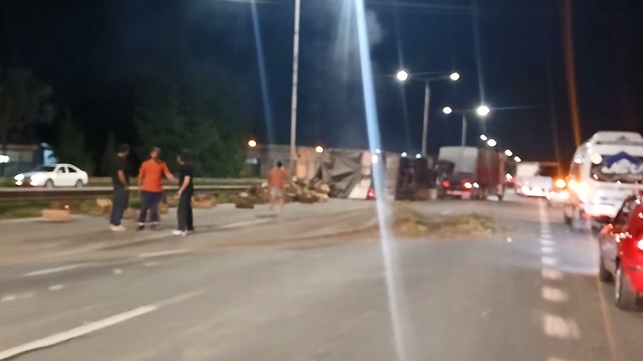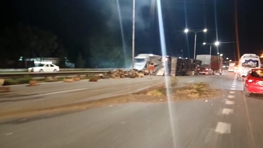 El violento choque ocurrió el lunes por la noche en la Ruta 9, frente a la pasarela de Villanueva y dejó como saldo el vuelco del acoplado de un camión cargado con cajones vacíos y un auto dado vuelta que terminó en contramano. No hubo heridos.
