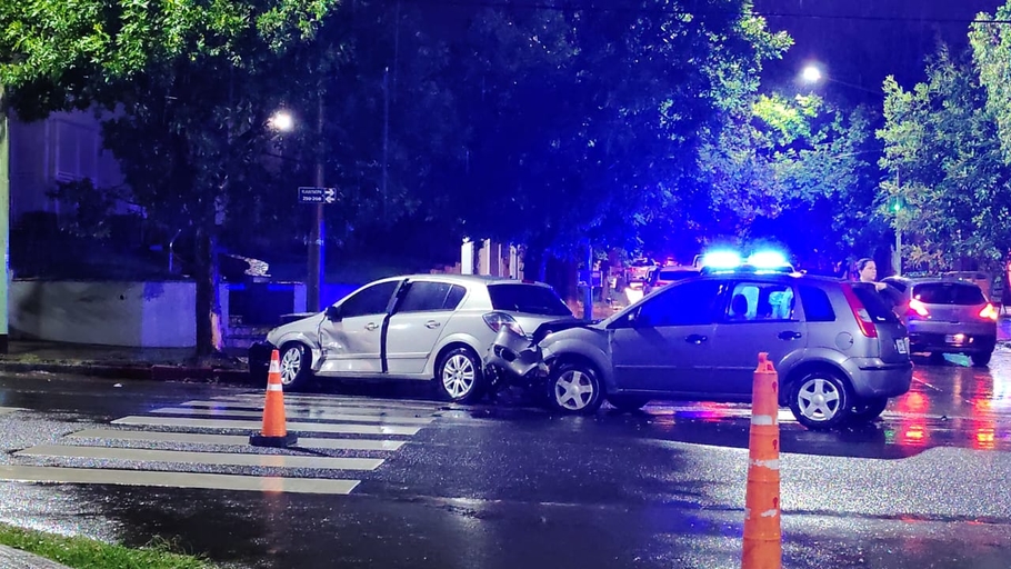 El fuerte choque entre un Chevrolet Vectra y un Ford Fiesta Max se registró este jueves alrededor de las 19 horas en la esquina de Rawson y Güemes, en medio de intensas lluvias que complicaban la visibilidad.