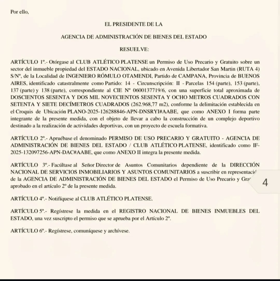 El Club Atlético Platense anunció en sus redes sociales una noticia histórica para su crecimiento institucional: la Agencia de Administración de Bienes del Estado (AABE) otorgó al “Calamar” un Permiso de Uso Precario y Gratuito para desarrollar su predio deportivo en la localidad de Ingeniero Rómulo Otamendi, partido de Campana.