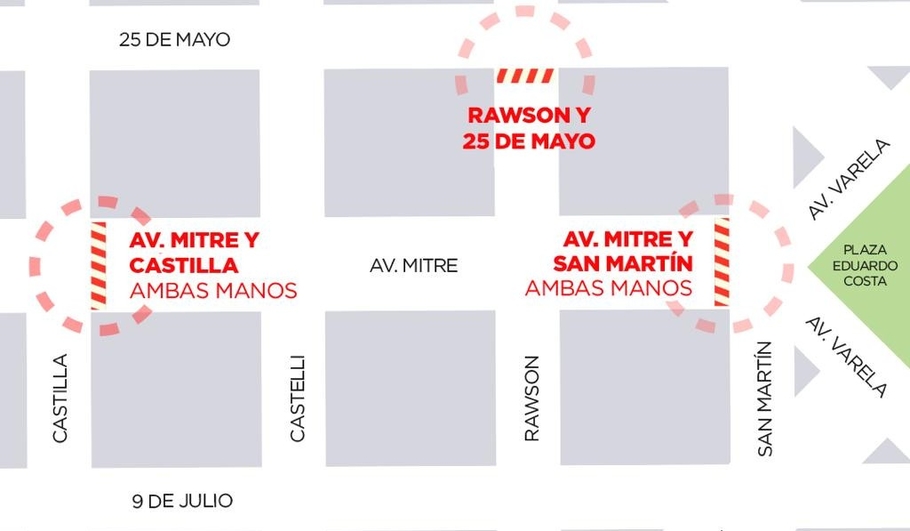 El mismo se pondrá en marcha a partir de las 21 horas del miércoles 31 de diciembre e implementará interrupciones al tránsito en las siguientes intersecciones: A. Mitre y Castilla; Rawson y 25 de Mayo y Av. Mitre y San Martín.
