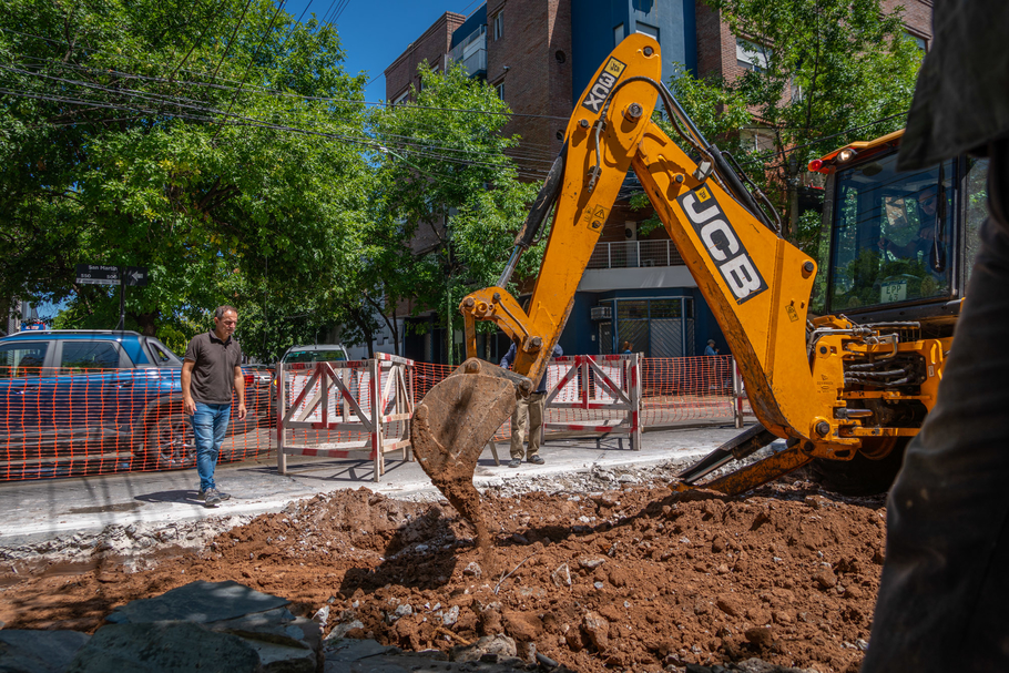 Y, esta semana, el intendente Sebastián Abella supervisó las tareas que se desarrollan sobre San Martín, esquina Estrada, donde maquinaria de gran porte se encuentra retirando el paño de hormigón dañado para su posterior reparación.