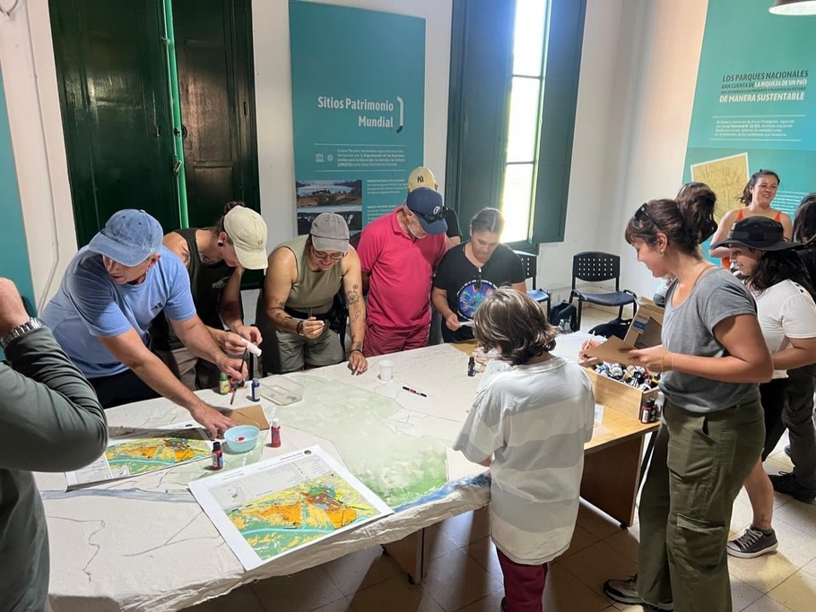 El cierre de la jornada estuvo a cargo de la voluntaria Romina Nicala, quien coordinó una actividad participativa que consistió en la intervención colectiva de un mapa del Parque sobre un lienzo. La propuesta invitó a reflexionar sobre el área protegida y los humedales como territorios socioecológicos, integrando arte, diálogo y construcción colectiva.