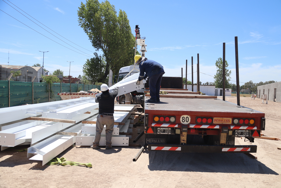 Y en la continuidad de la obra, mientras avanzan las tareas de mampostería, esta semana llegaron las columnas y las vigas metálicas que conformarán la nave principal del microestadio que tendrá 4.000 metros cuadrados.