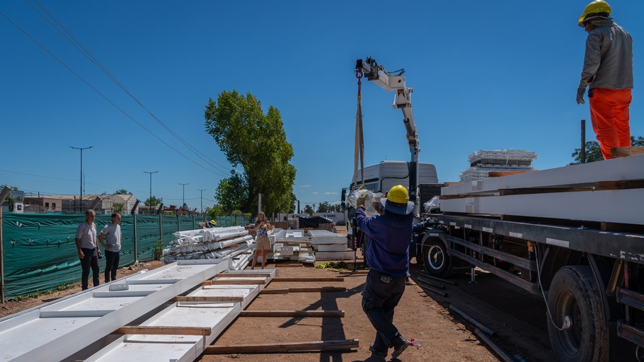 Allí, el jefe comunal constató el arribo de las columnas y las vigas metálicas que conformarán la nave principal del microestadio que tendrá 4.000 metros cuadrados.