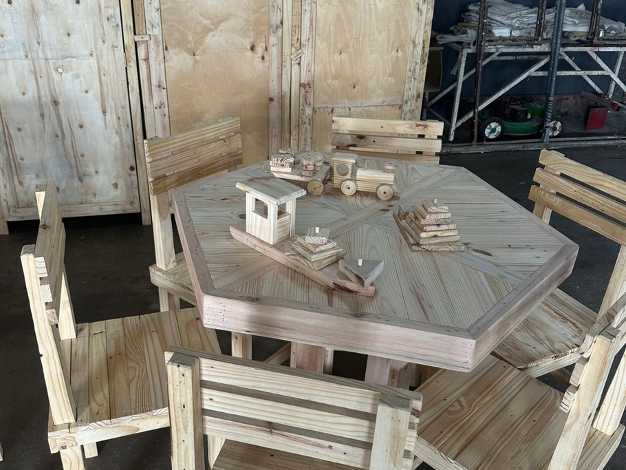 La entidad beneficiada fue la Escuela de Educación Primaria N° 14 y recibió tres mesas hexagonales, 18 sillas, 5 armarios y 10 juegos didácticos, todos confeccionados con pallets reciclados.
