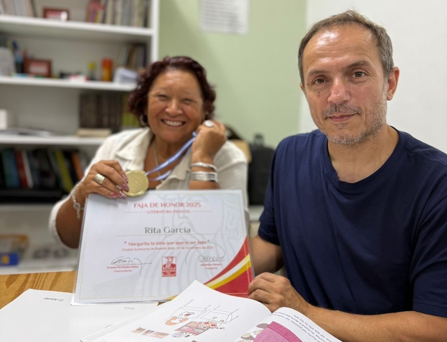 Abella felicitó a la escritora Rita García, quien recientemente fue reconocida por su obra “La niña que quería ser feliz”.