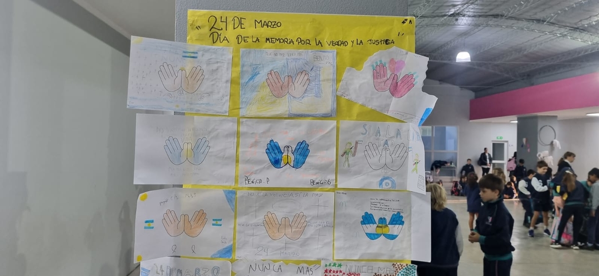 En el marco de los 50 años del golpe cívico-militar, el colegio realizó un acto emotivo que involucró a toda su comunidad. Las familias y estudiantes participaron en la creación de pañuelos con frases reflexivas, mientras que en las aulas se trabajó la temática que luego fue compartida en una charla con aportes de los alumnos.