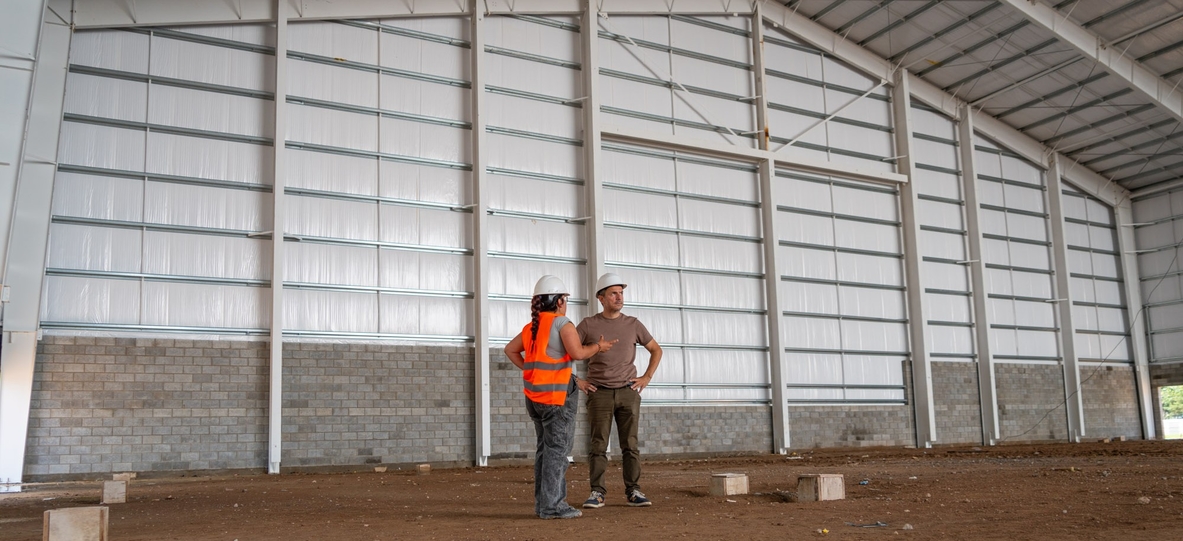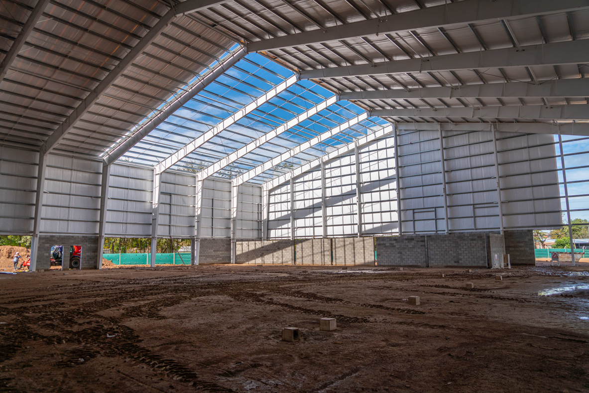 Actualmente se desarrollan tareas de techado que incluyen la colocación de chapas sobre la estructura metálica principal, junto con cerramientos parciales en mampostería de ladrillos de cemento y laterales en chapa galvanizada.