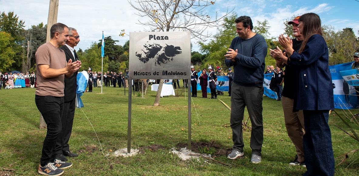 El jefe comunal, acompañado por la secretaria de Inclusión, Educación y Cultura, Elisa Abella, y concejales compartieron el encuentro realizado en la plaza del barrio junto a los vecinos, donde se descubrió la placa con la leyenda “Héroes de Malvinas”, nombre que se le impuso al espacio público.